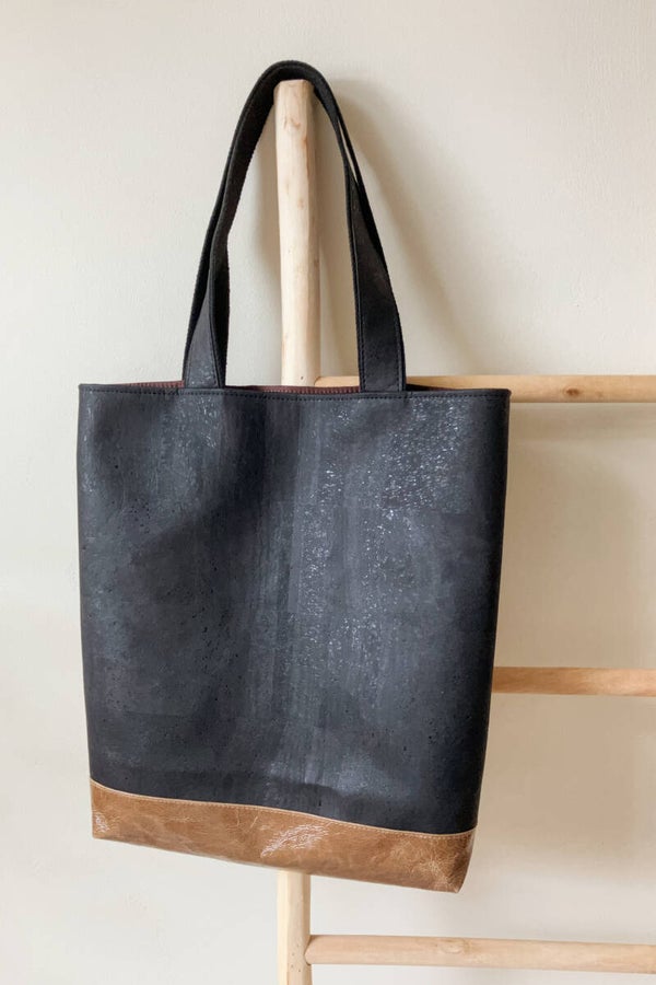 De handvaten zijn gemaakt van sterk katoenen tassenband, stijlvol afgewerkt met zwart kurkleer voor extra duurzaamheid en een luxe uitstraling.