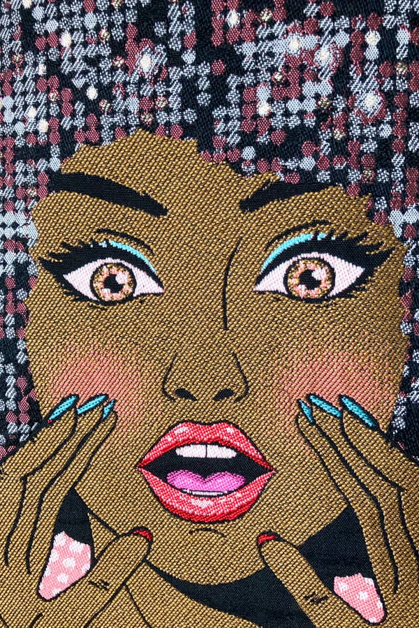 De voorkant van de tas is voorzien van een opvallend gobelin paneel met een discostijl afro dame – een echte eyecatcher. De bodem is gemaakt van gekrakeleerd** bruin leder voor een vintage look terwijl de achterkant gemaakt is uit stijlvol zwart kurkleer, wat zorgt voor een unieke mix van texturen en materialen.